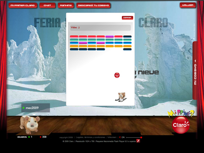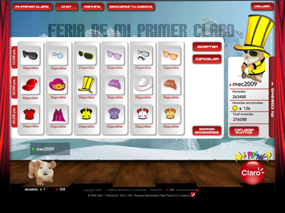 Desarrollo e implementación de "La feria del Cobayo". Diseño de interfaces gráficas para cada escenario. Se implementaron 10 Juegos preestablecidos por la firma Claro Argentina, por intermedio de la Agencia EURO RSCG BUENOS AIRES. Los mismos presentan un sistema de Puntos programado. Se desarrollaró una sección de Chat como un escenario más (Bar) donde cada usuario podrá chatear con otros usuarios conectados. Logramos crear un verdadero ambiente de entretenimiento focalizado al segmento de clientes que Claro busca con su campaña "Cobayo"