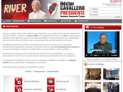 El nuevo website fue realizado con el objeto de mostrar la imagen de Hector Cavallero de cara a la elecciones presidenciales en River Plate. El mismo contiene toda la información de su campaña política, con imagenes y videos (canal YouTube). Encontrarás secciones como "Participá", "Reuniones con Héctor" y "Novedades" todas ellas conectadas a la red social de Facebook y Twitter generando más enlaces y visitas en el sitio. Inclusión en canal RSS. Se trabajo en diseño y programación obteniendo un completa herramienta para su perfil de candidato.