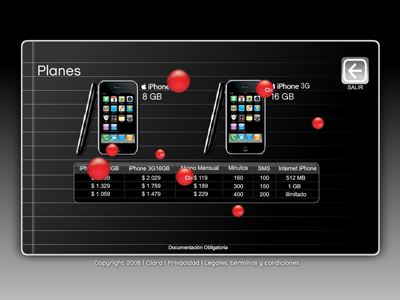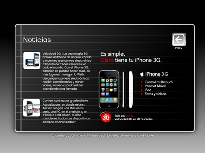 Desarrollo del Micrositio Pomocional para Iphone 3G Claro. El mismo presenta secciones como "Donde Comprar", "Noticas" y "Planes", además del video comercial que promociona el producto. El sitio web está realizado íntegramente en Flash con efectos en 3D que refuerzan la estética moderna del micrositio.