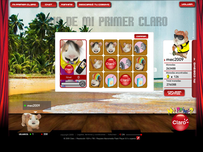 Desarrollo e implementación de "La feria del Cobayo". Diseño de interfaces gráficas para cada escenario. Se implementaron 10 Juegos preestablecidos por la firma Claro Argentina, por intermedio de la Agencia EURO RSCG BUENOS AIRES. Los mismos presentan un sistema de Puntos programado. Se desarrollaró una sección de Chat como un escenario más (Bar) donde cada usuario podrá chatear con otros usuarios conectados. Logramos crear un verdadero ambiente de entretenimiento focalizado al segmento de clientes que Claro busca con su campaña "Cobayo"